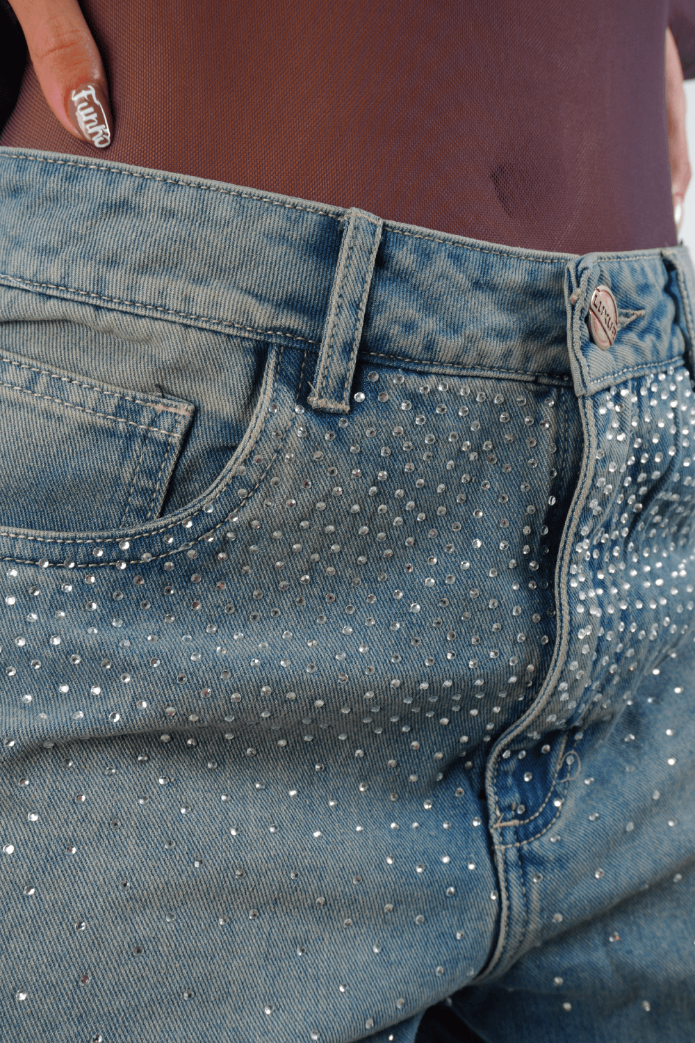 Jean de silueta amplia en tono azul vintage con efecto de lavandería, decorado con una pedrería en degradé. Su diseño combina la estética urbana del denim desgastado con el lujo del brillo artesanal, creando una prenda sofisticada y de tendencia.