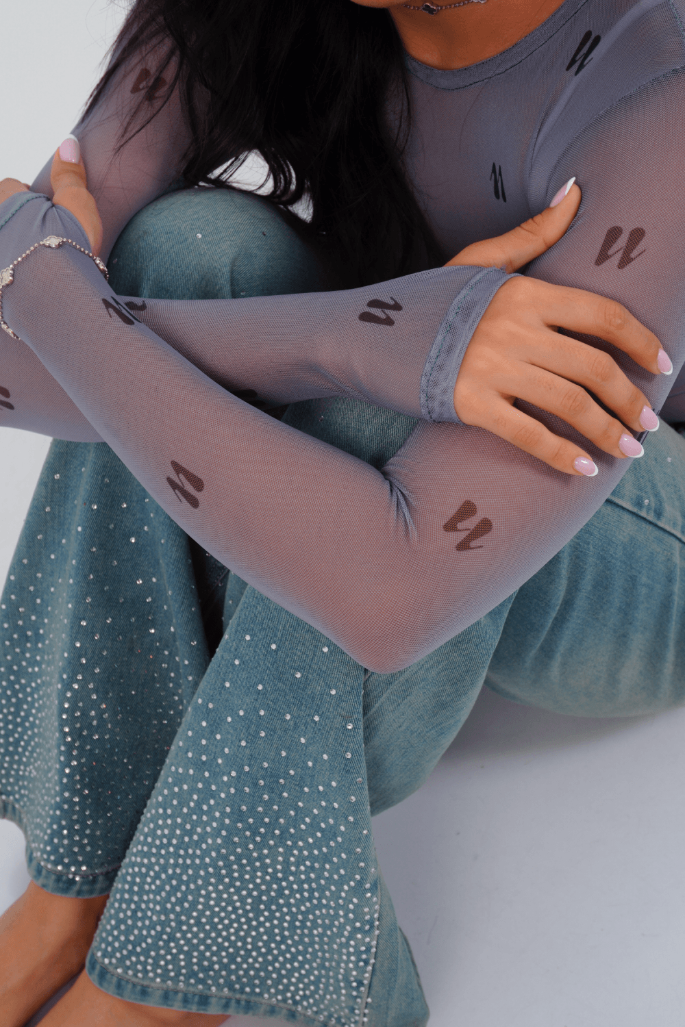 Body de manga larga confeccionado en malla elástica (mesh) color café humo. Destaca por un sofisticado diseño de pedrería aplicada en degradé a lo largo de las mangas, aportando un brillo progresivo que realza el movimiento. Es una pieza de alto impacto visual, ideal para looks de noche o eventos especiales.