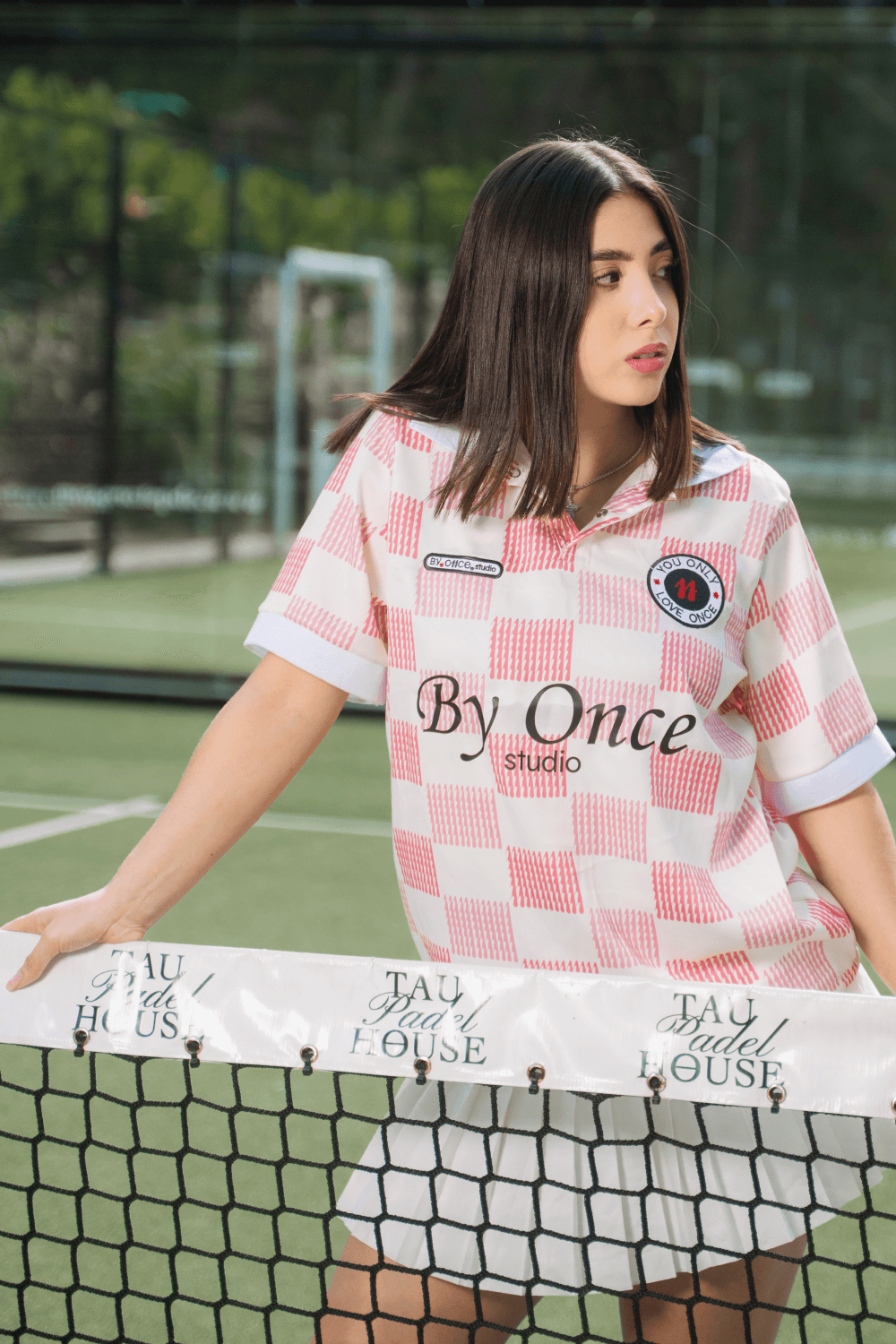 Camiseta tipo polo confeccionada en tejido luminoso de poliéster. Diseño con estampado geométrico de cuadros formados por la repetición de nuestro número “11” en color rosa sobre fondo crema. Cuello camisero y puños en rib blanco. Presenta bordado frontal con nuestro escudo “You Only Love Once” y el logotipo “By Once studio”. Corte regular y costuras reforzadas. Ideal para uso casual.