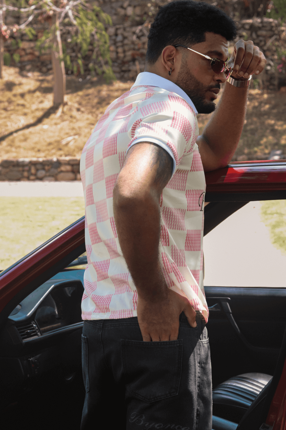 Camiseta tipo polo con un diseño moderno y deportivo en tonos crema y rosado que le da un aire retro y divertido. El cuello y los puños en blanco contrastan perfectamente con el patrón, aportando un toque clásico. Destacan los parches de nuestro escudo y el logo “By Once studio” en el pecho, ideales para un look casual-sport.